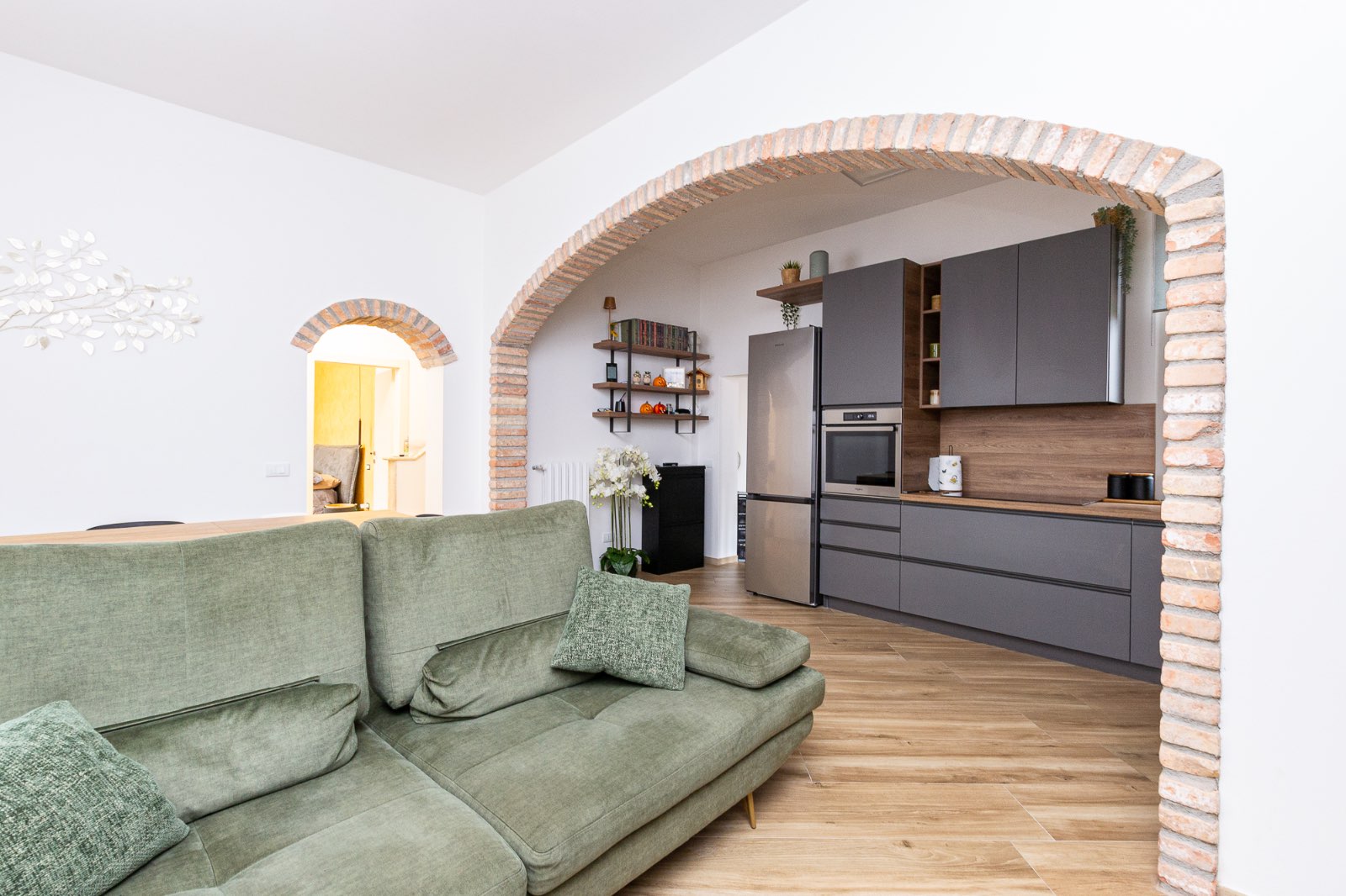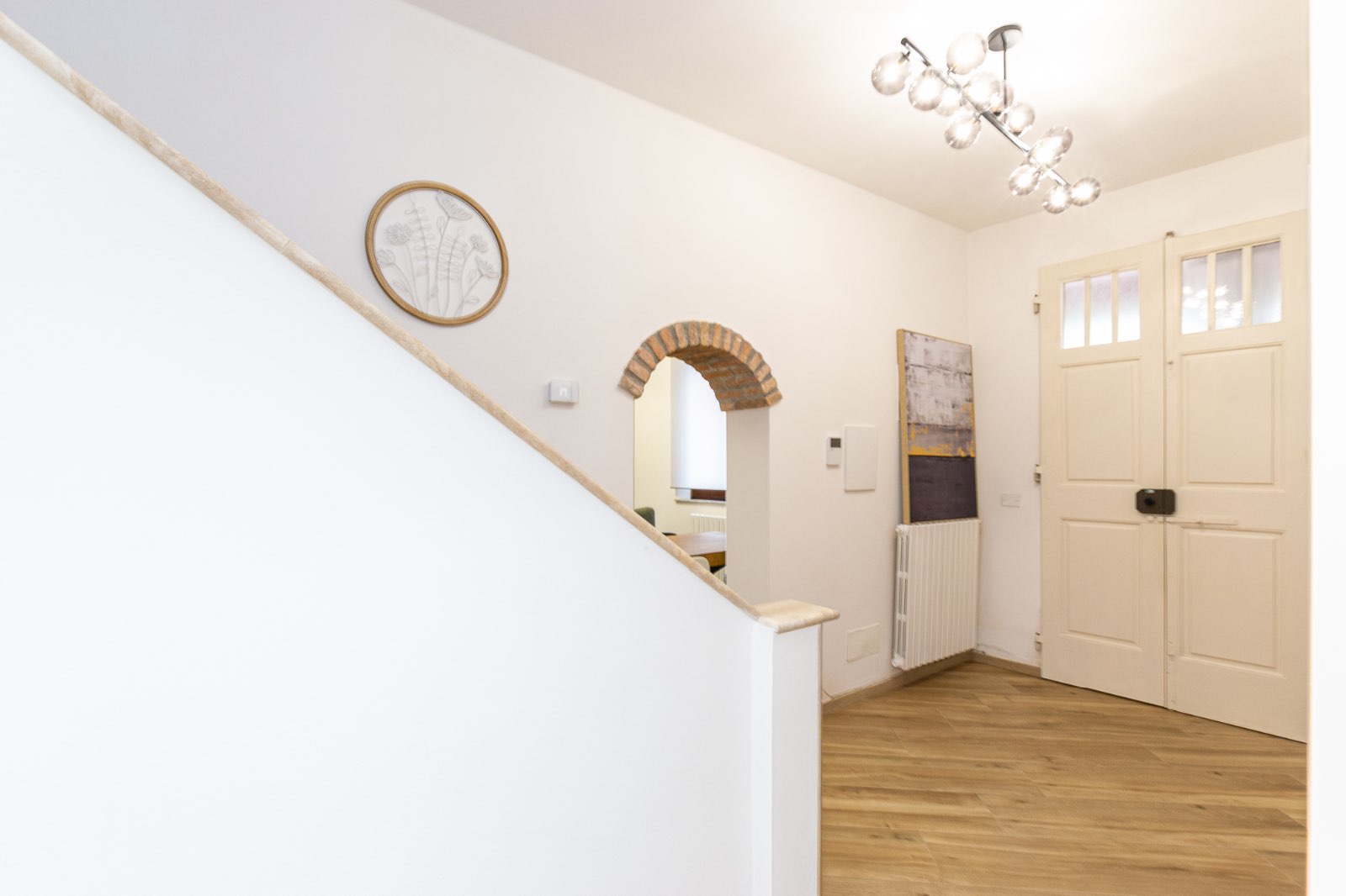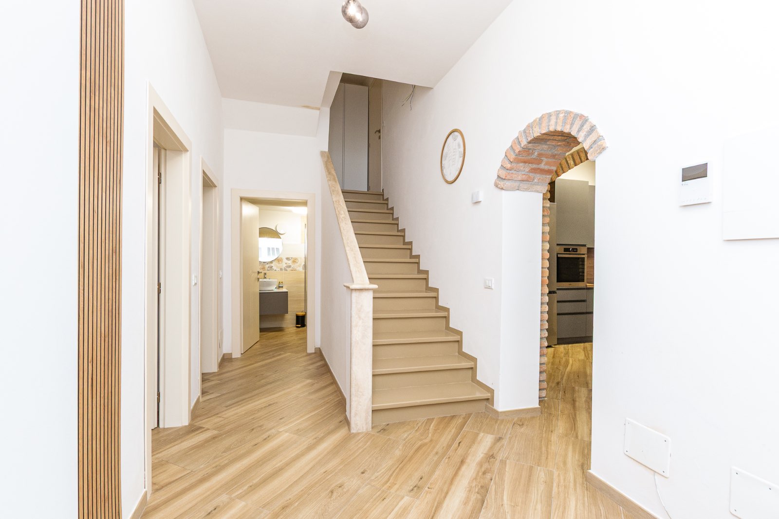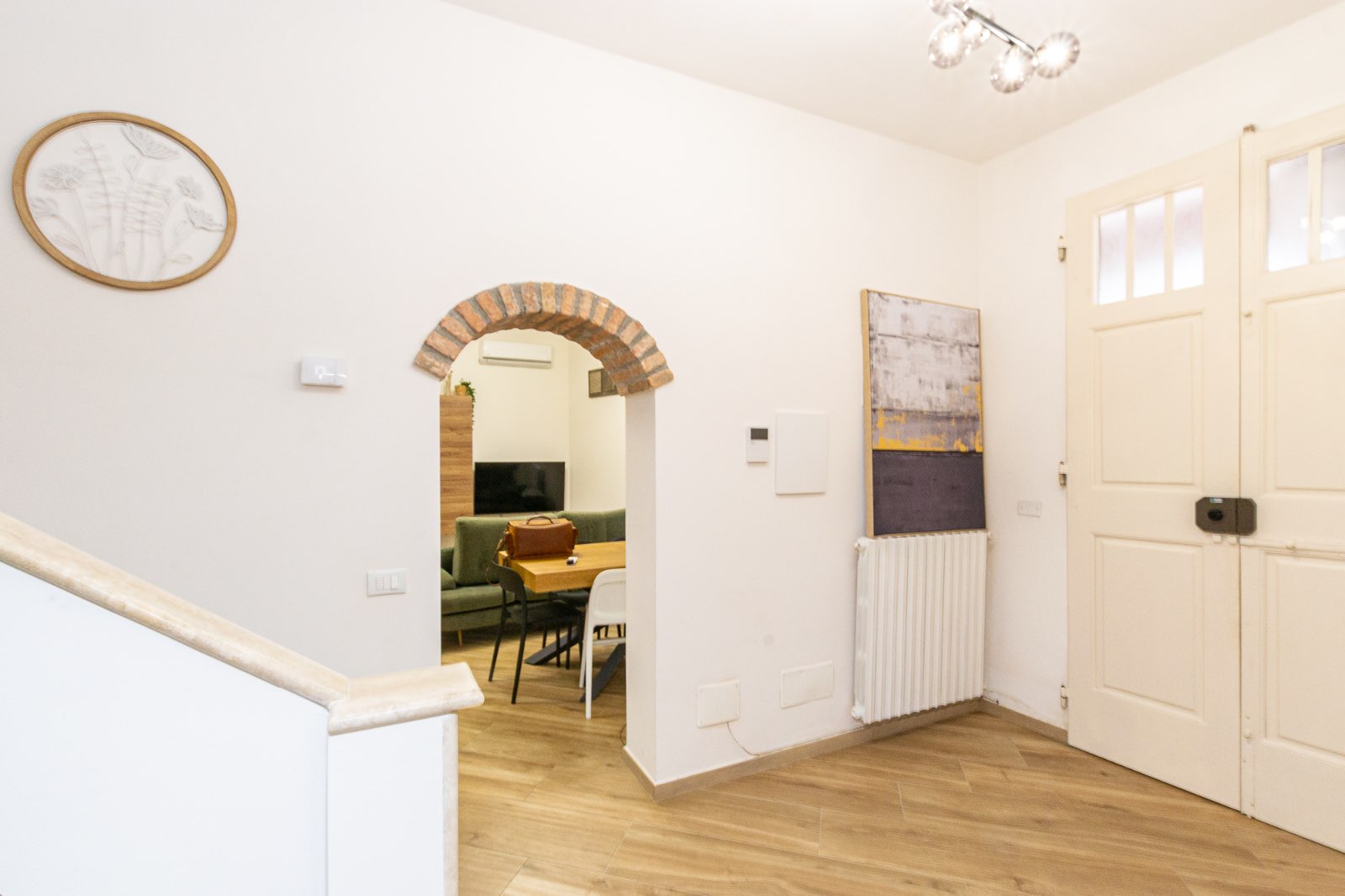 L’immobile si apre su un ampio resede piastrellato, accessibile tramite cancello pedonale, perfetto come spazio esterno per relax o convivialità. L’ingresso, ampio e funzionale, conduce alla zona giorno composta da soggiorno con cucina a vista, caratterizzato da eleganti archi in stile toscano che donano calore e personalità all’ambiente.