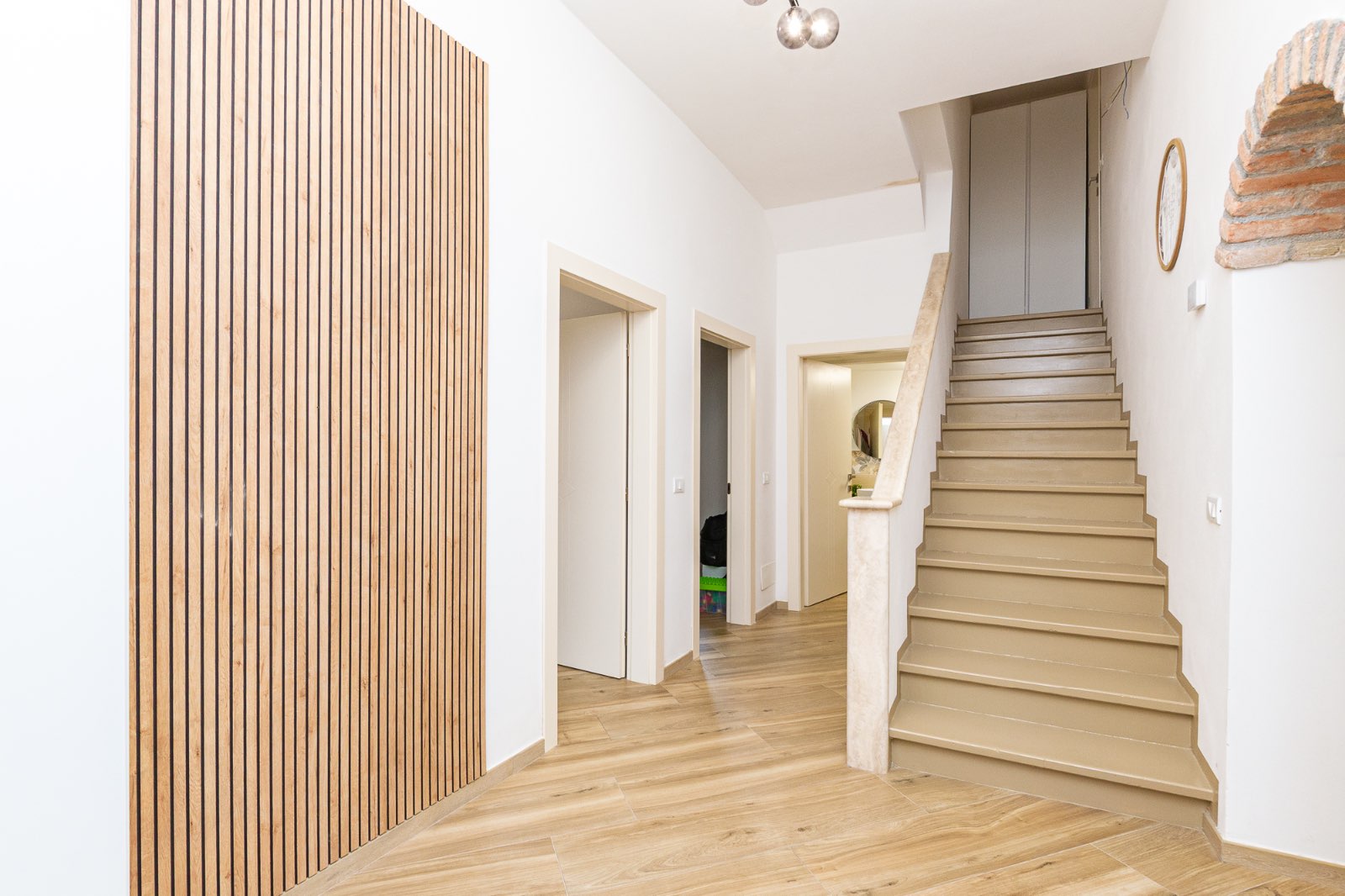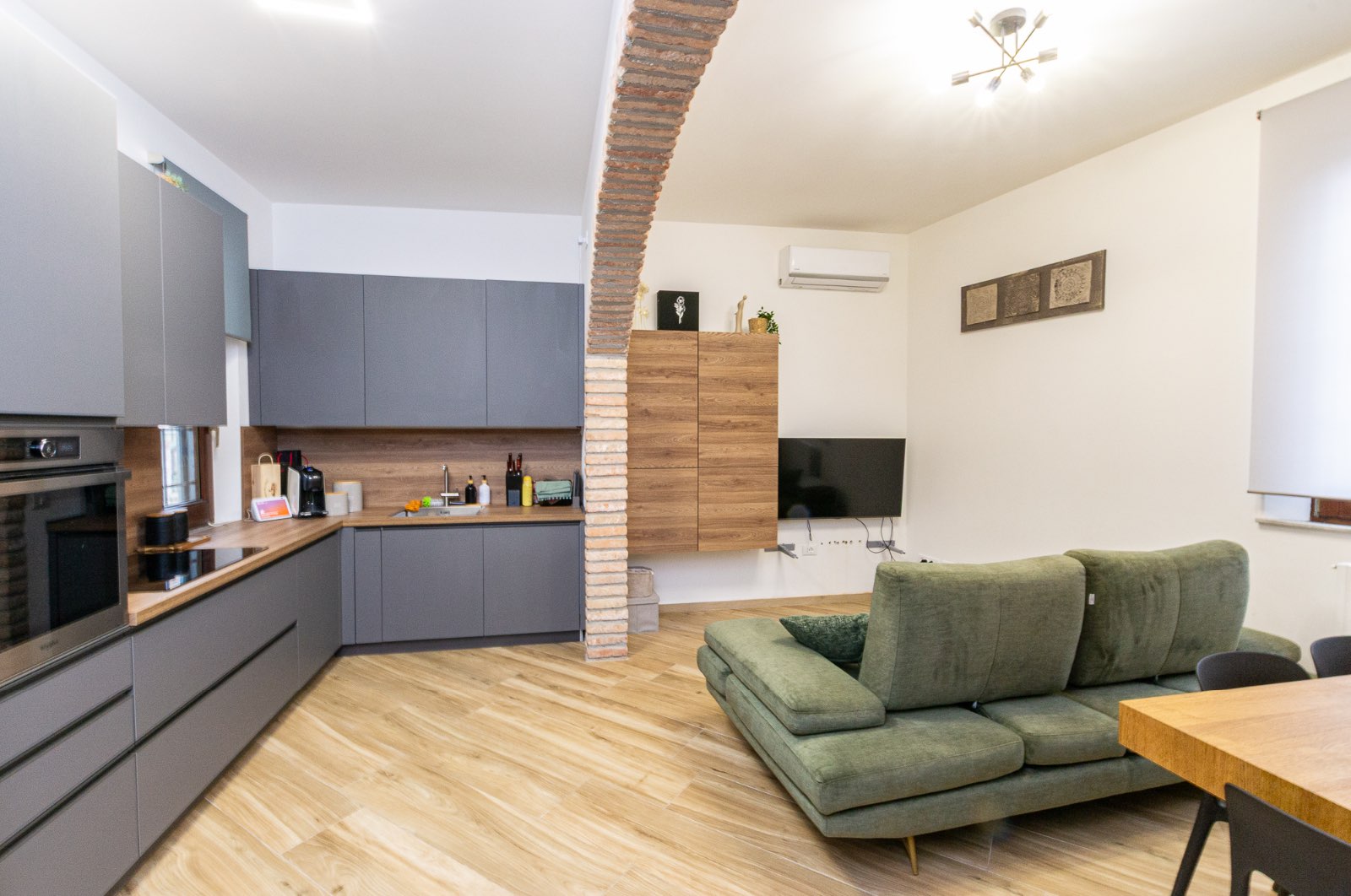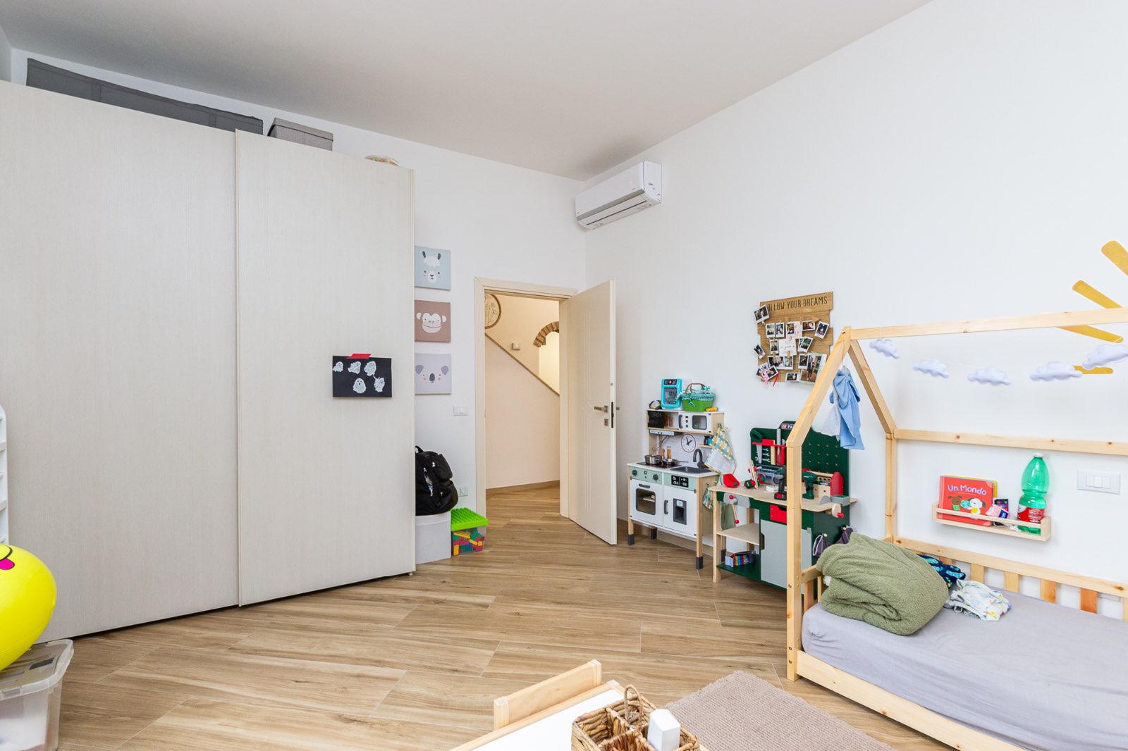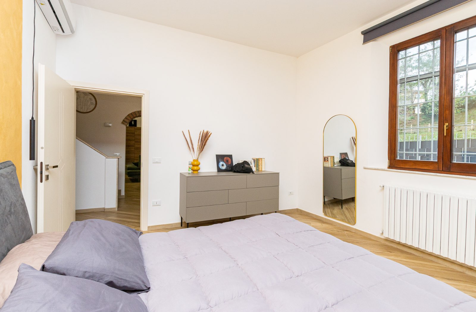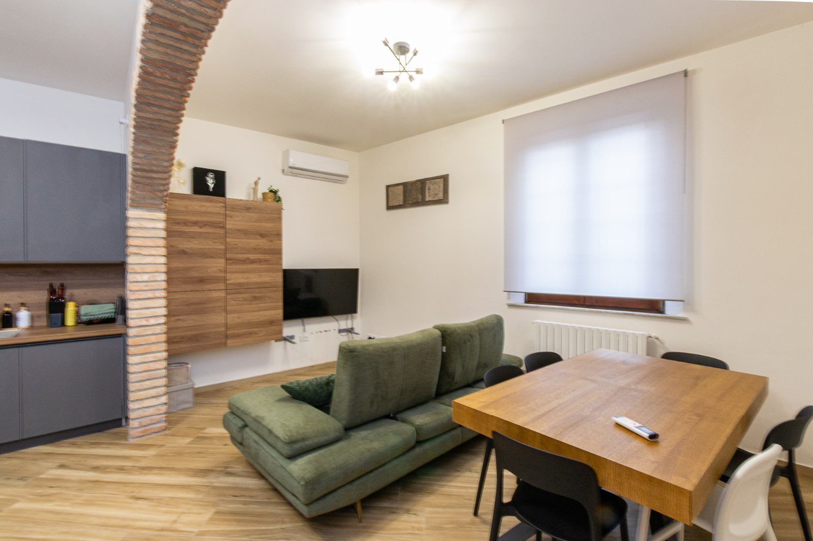 L’immobile si apre su un ampio resede piastrellato, accessibile tramite cancello pedonale, perfetto come spazio esterno per relax o convivialità. L’ingresso, ampio e funzionale, conduce alla zona giorno composta da soggiorno con cucina a vista, caratterizzato da eleganti archi in stile toscano che donano calore e personalità all’ambiente.