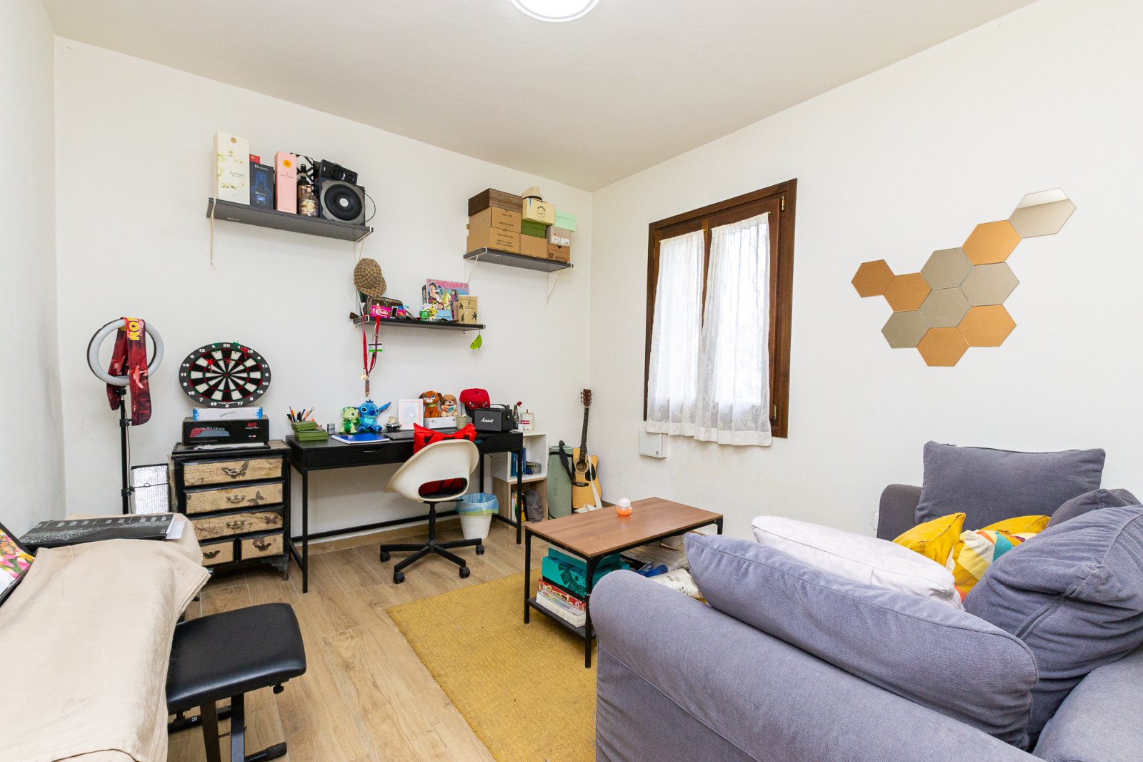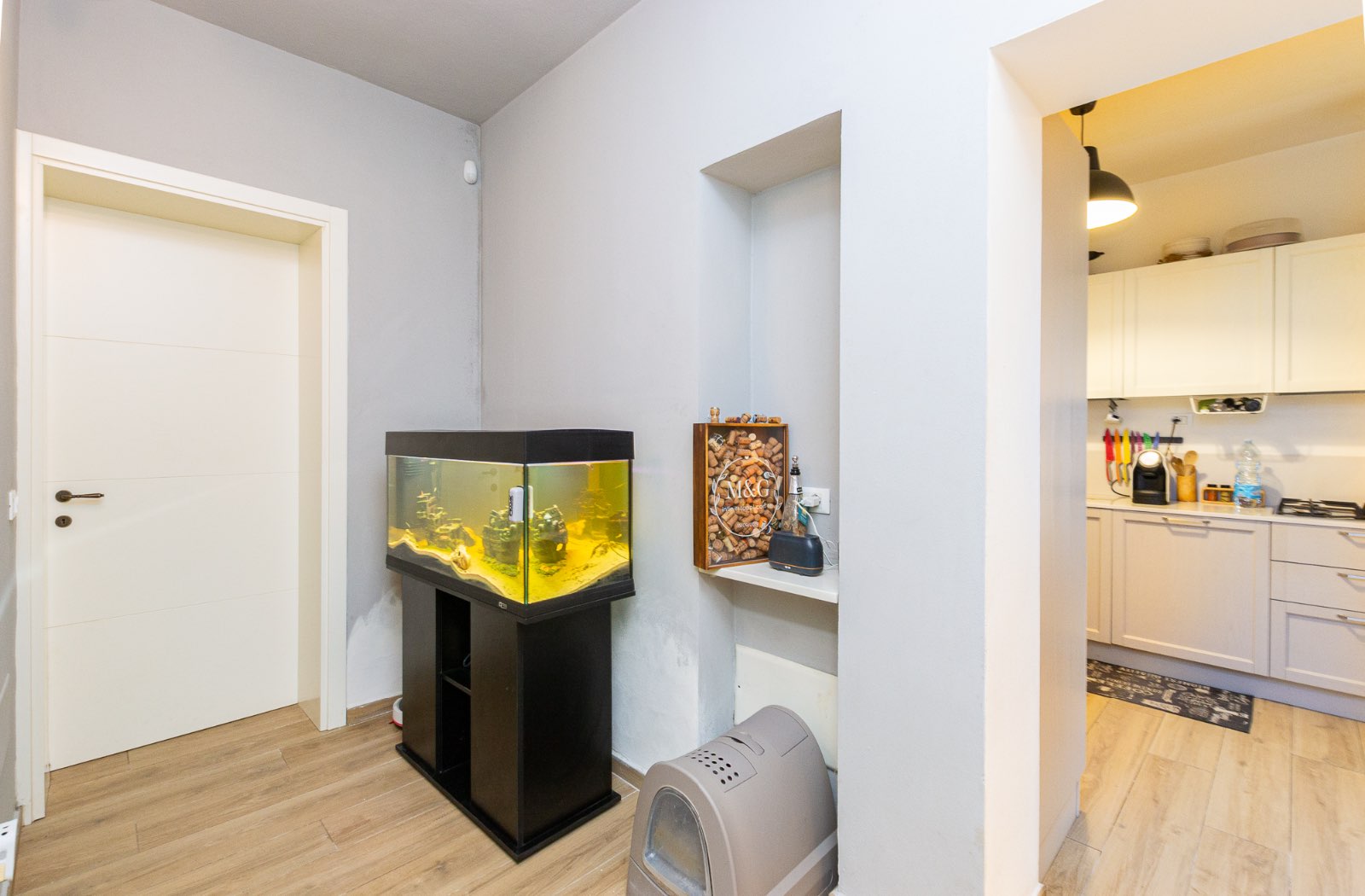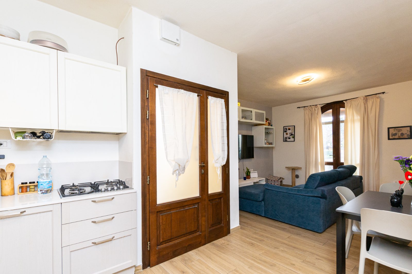 L’ingresso avviene attraverso una loggia ed il soggiorno, luminoso e accogliente, è arricchito da una porta finestra che si apre sul resede esterno privato, creando una piacevole continuità tra gli spazi interni ed esterni: ideale per momenti di convivialità.