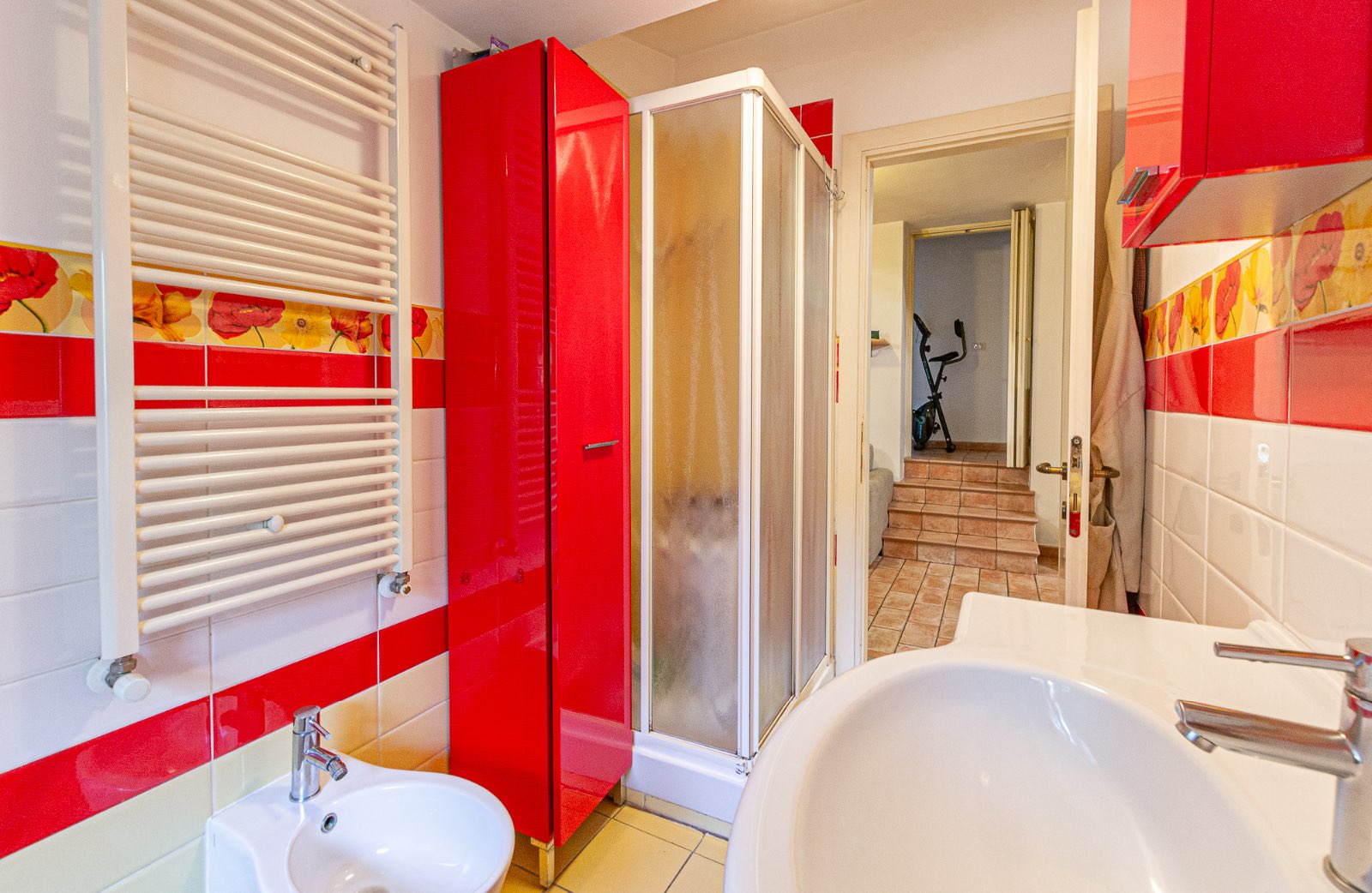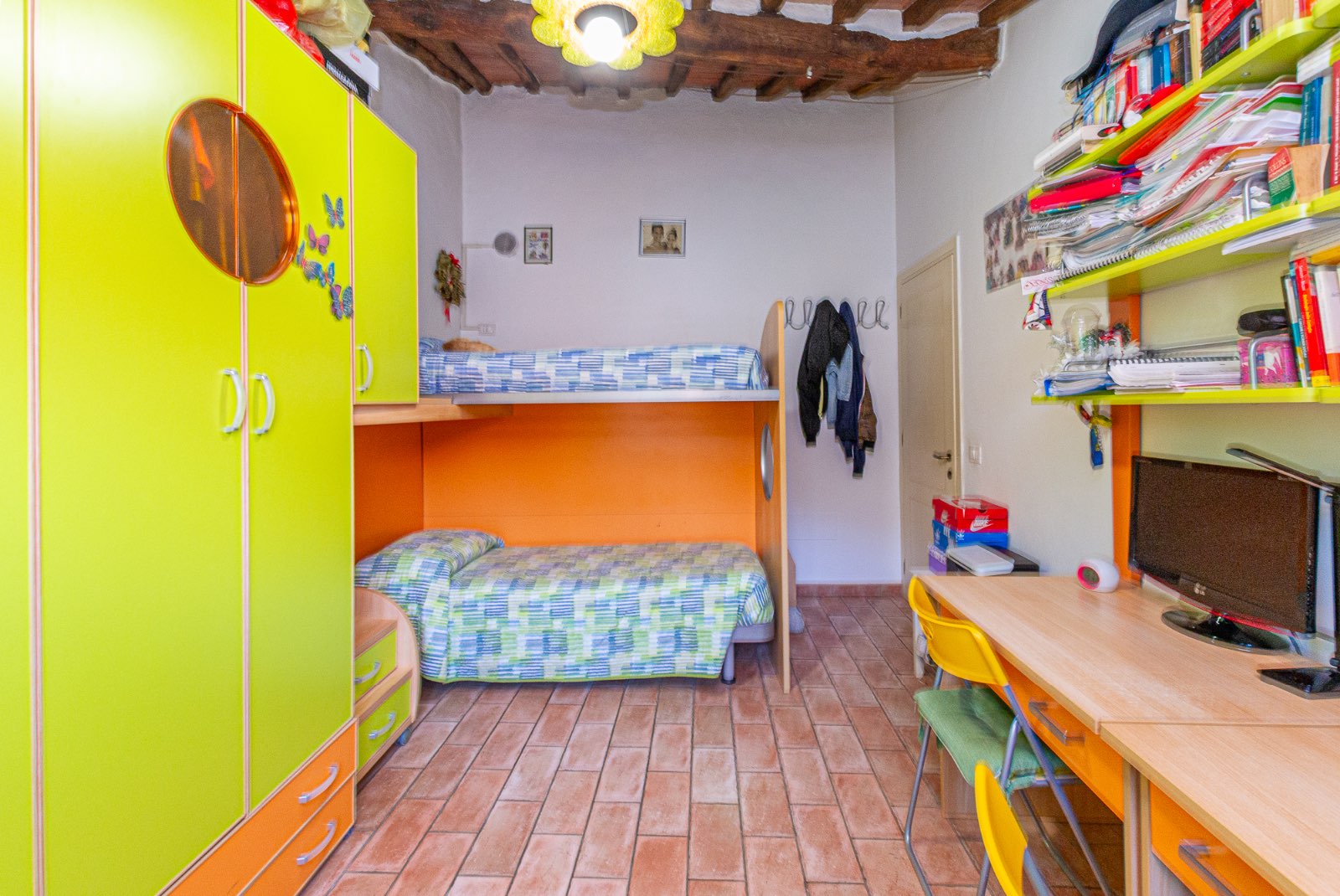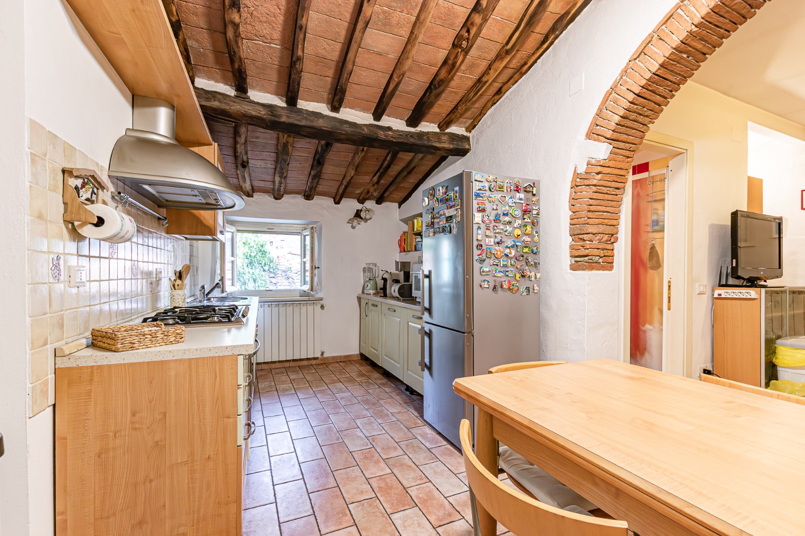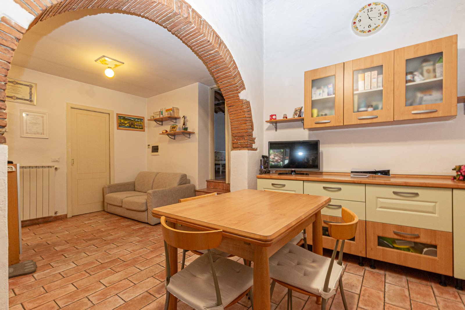 I soffitti con travi e travicelli in legno e gli archi in mattoni a vista donano all’appartamento un’atmosfera calda e autentica, tipica dello stile toscano, rendendolo la scelta ideale per giovani coppie in cerca di un’abitazione con carattere e comfort.
