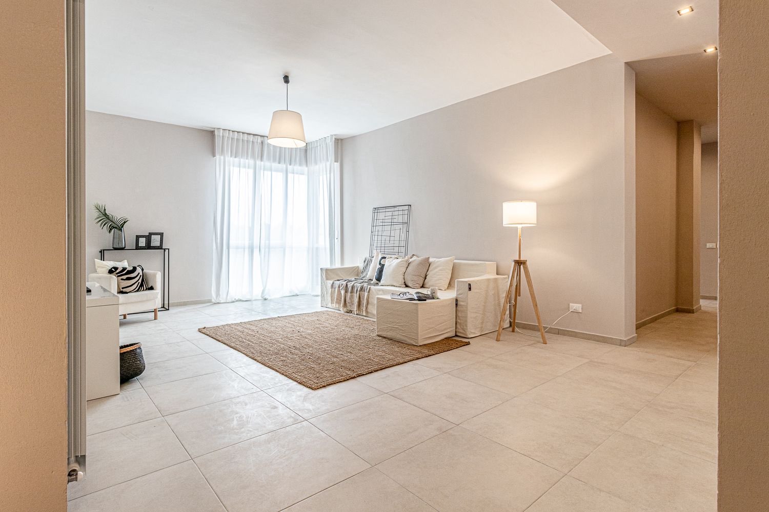 Varchi la porta d'ingresso e ti accoglie un bel disimpegno con comodo vano ripostiglio e un grande soggiorno, il cuore della casa, inondato di luce naturale grazie a 2 porte finestre disposte ad angolo. Vedi la zona living aprirsi verso la sala da pranzo e condurti alla cucina ampia e angolare, pensata per cucinare stando in compagnia: una penisola divide con eleganza la zona pranzo e il balcone ti regala la possibilità un caffè all'aperto. Dal soggiorno esci su un secondo terrazzo con affaccio aperto su una piazza e senza fabbricati di fronte. Dal disimpegno raggiungi la zona notte: 2 camere matrimoniali e 1ampia camera singola. Gli ambienti sono flessibili e facili da arredare, con sufficienti mq ideali per letti king size, armadi capienti e angoli di lavoro o relax.